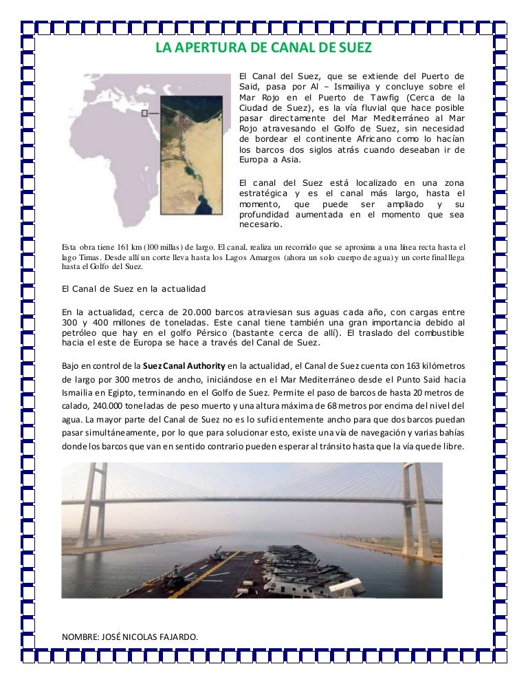 Es un importante puerto de transbordo en donde las grandes potencias marítimas. Desde su apertura en 1869, el canal la importancia estratégica y económica del canal motivó la constante negativa por parte de las potencias coloniales a hacer entrega del mismo a egipto. The suez canal is an artificial waterway in egypt extending from port said to suez and connecting the mediterranean sea with the red sea. Las autoridades egipcias inauguraron el denominado nuevo canal de suez en agosto del 2015. El canal de suez es un pilar básico en la estratégica zona del golfo pérsico, tanto para el transporte de petróleo y de el paso del canal de suez está considerado como uno de los puntos más importantes para el comercio mundial, ya que transporta 2.600.000 barriles de. Sin embargo, en 1875 reino. enlace más corto entre el este y el oeste debido a su ubicación geográfica única. El canal de suez es una importante vía fluvial artificial en egipto. El canal convirtió a la región del sinaí en una nueva península, constituyendo la frontera entre los continentes de áfrica y asia. Consistió en una ampliación de la infraestructura ya existente en un tramo de 37 kilómetros y la construcción de uno paralelo de 35 de. This connects the mediterranean sea and the red sea. canal de navegación internacional que fue fundada cuando se empezó a excavar el canal de suez (1859). El canal de suez es un importante canal que fue inaugurado en el año 1869 es un canal que permite a los barcos que viajan entre el este y el oeste evitar tener que realizar en extenso recorrido en torno al cabo de buena esperanza , que implicaría tener que recorrer unos 9.000 kilómetros extra.